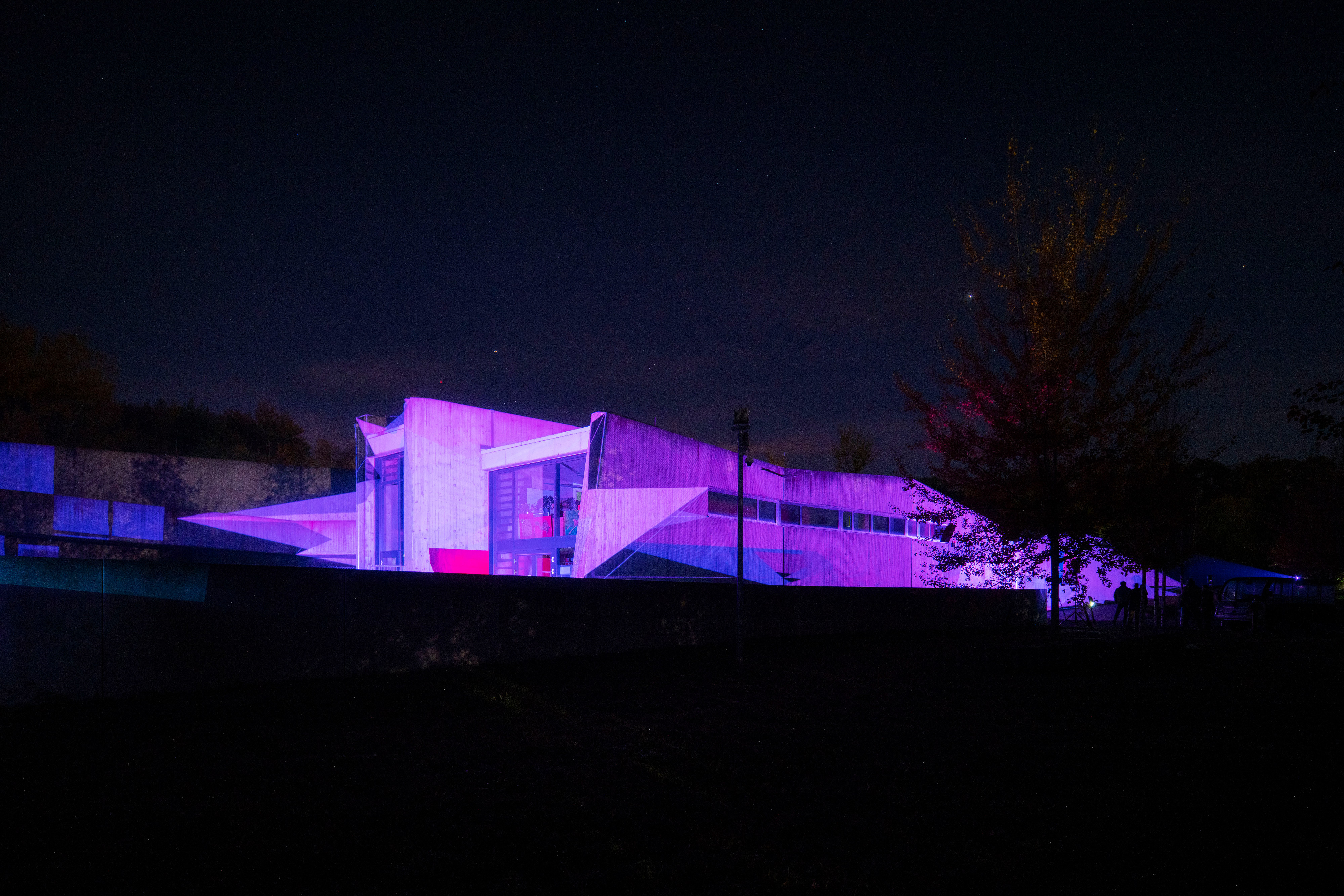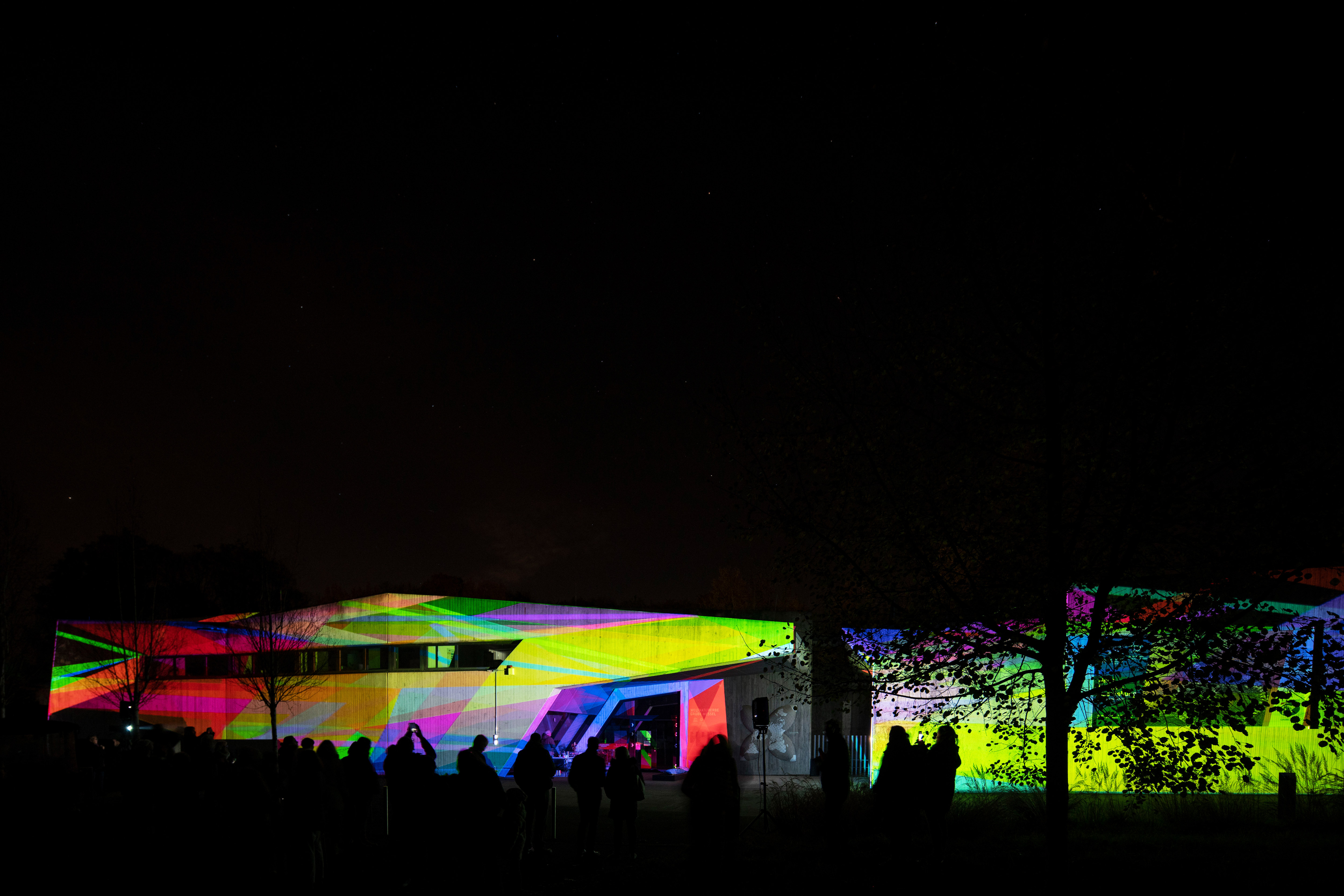 Messel, 01. November 2021. Auf spektakuläre Weise bemalten die Künstler Daniela und Pascal Kulcsár mit ihrem Projekt „Flashlines“ vergangene Woche die Außenflächen des Besucherzentrums der Grube Messel. Die interaktive Lichtshow anlässlich des 75-jährigen Jubiläums begann am Mittwoch nach Einbruch der Dunkelheit und zog, trotz kühler Temperaturen, im Laufe des Abends rund 250 Besucher in ihren Bann.