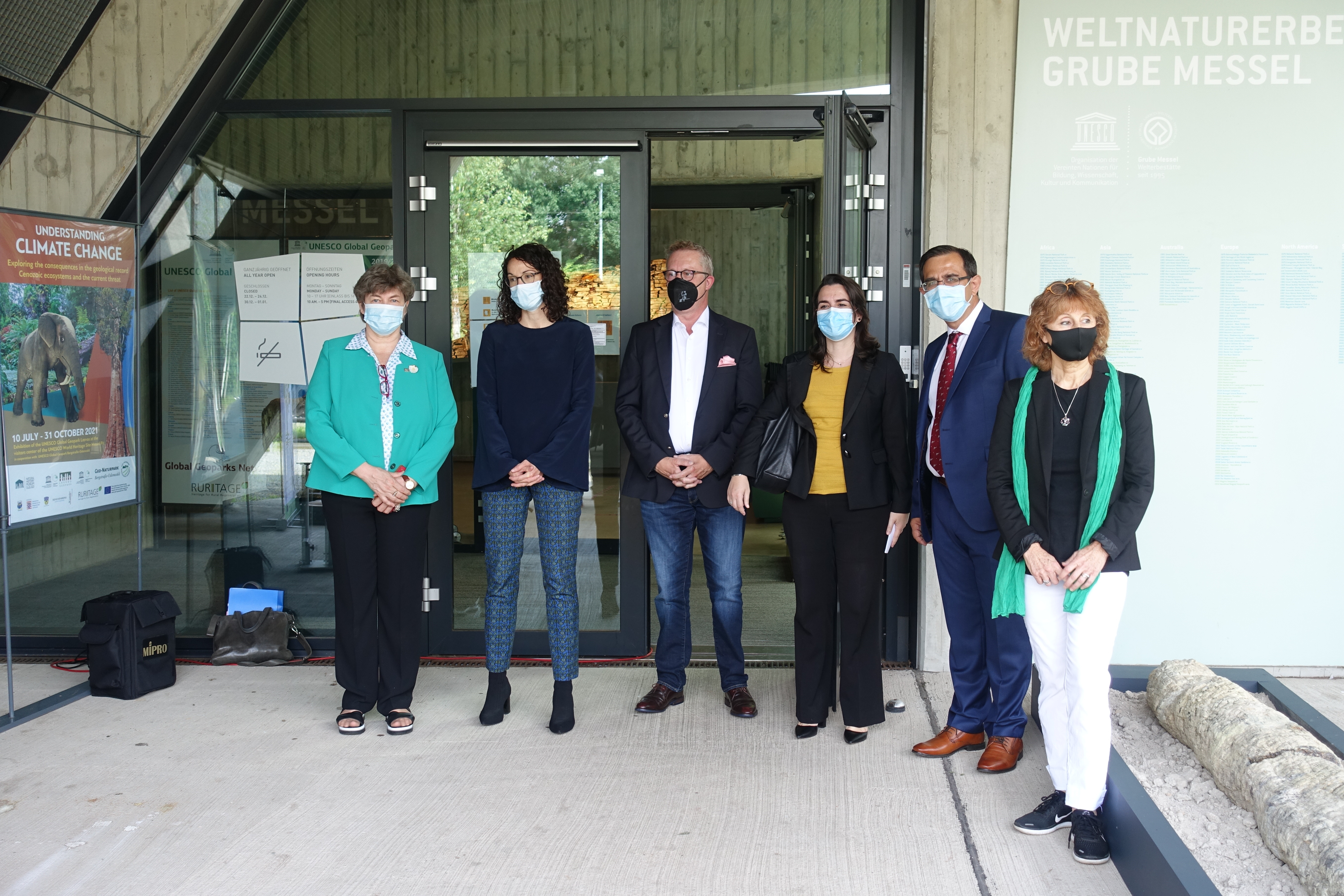 Messel, 12. Juli 2021. Angela Dorn, Staatsministerin des Hessischen Ministeriums für Wissenschaft und Kunst, eröffnete an diesem Wochenende im Beisein von Ionna Kriebardi, Generalkonsulin der Hellenischen Republik Griechenland, sowie Prof. Dr. Nikolaos Zouros, Direktor UNESCO Global Geopark Lesbos, die Sonderausstellung „Klimawandel verstehen“ am Besucherzentrum des UNESCO Welterbes Grube Messel.